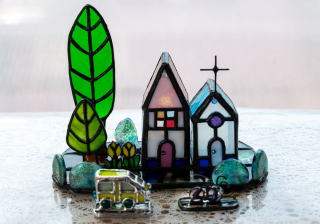 K.sさんが制作したサンキャッチャー。どのガラスも非常に魅力的。上二つのコーナーと花心はフュージングで制作しています。