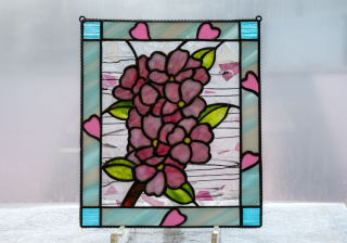 K.sさんが制作したサンキャッチャー。こちらも桜。春待つ心をステンドグラスに託して。